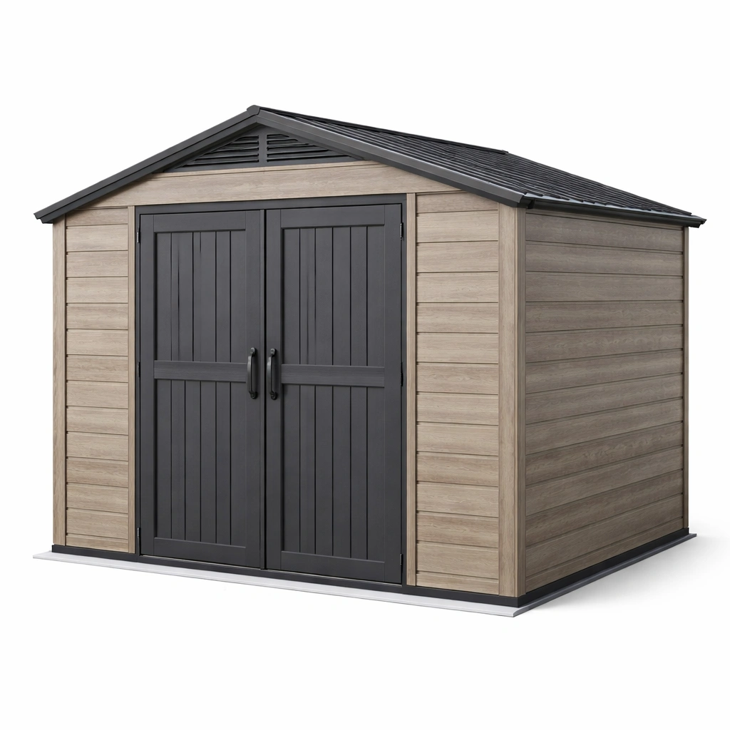 El cobertizo está fabricado con paneles de resina de polipropileno de alta densidad y una estructura de acero galvanizado. Sus dimensiones son 257 cm de largo, 272 cm de ancho y 226 cm de alto. Diseñado con un techo a dos aguas y paredes verticales con ventilación integrada, es impermeable y ofrece un mecanismo de cierre seguro. El material incluye un tratamiento UV en la superficie y es resistente a la corrosión.