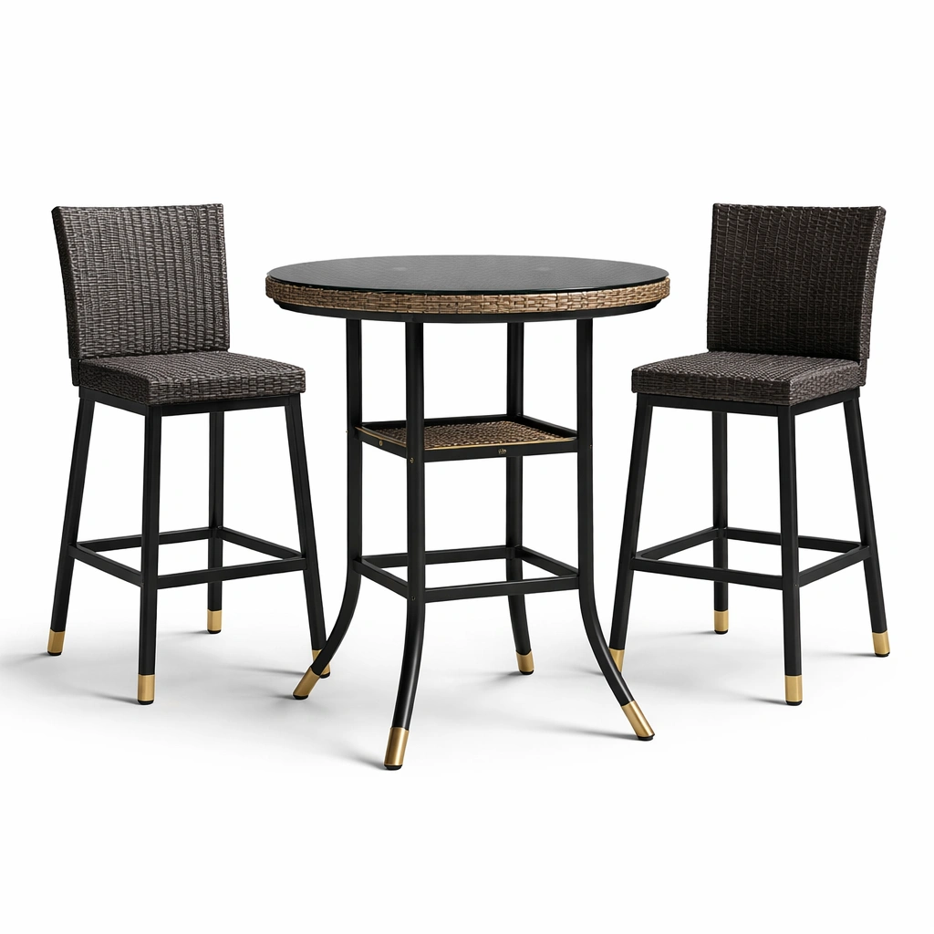 Material: Estructura de aluminio, superficie de mesa de vidrio templado de 5 mm, tejido de ratán sintético.