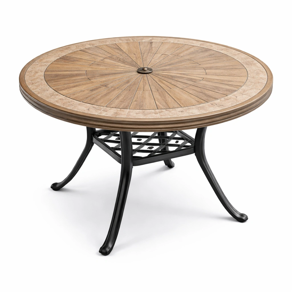 Materiales: Madera de teca en el tablero con borde de mármol travertino, base de aluminio fundido.